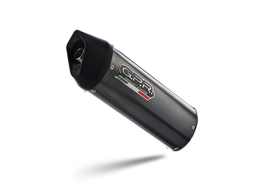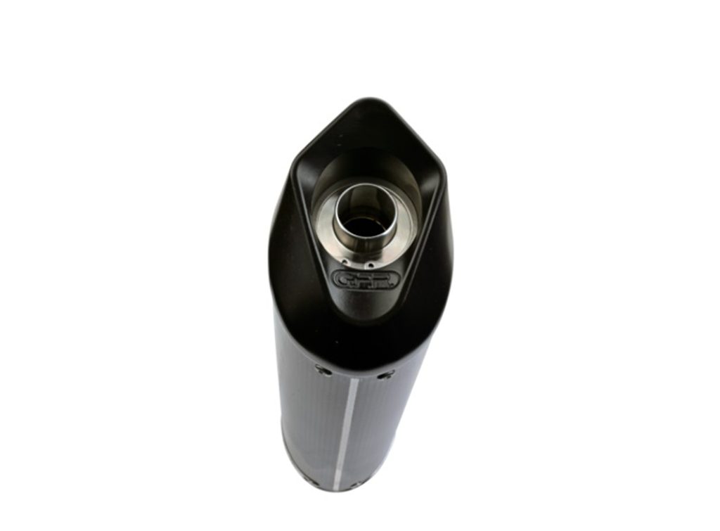 GPR's Furore Poppy silencer has a carbon look, stainless body and has been developed with a production process that produces zero impact to the environment. It has an oval shape with a diameter of 120MM, with avional bottoms produced by CNC machining.