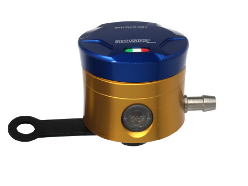 Accossato CNC-worked brake fluid reservoir, capacity of 25 cm3, horizontal oil spill. Straight braket provided. You can choose the colour match of the