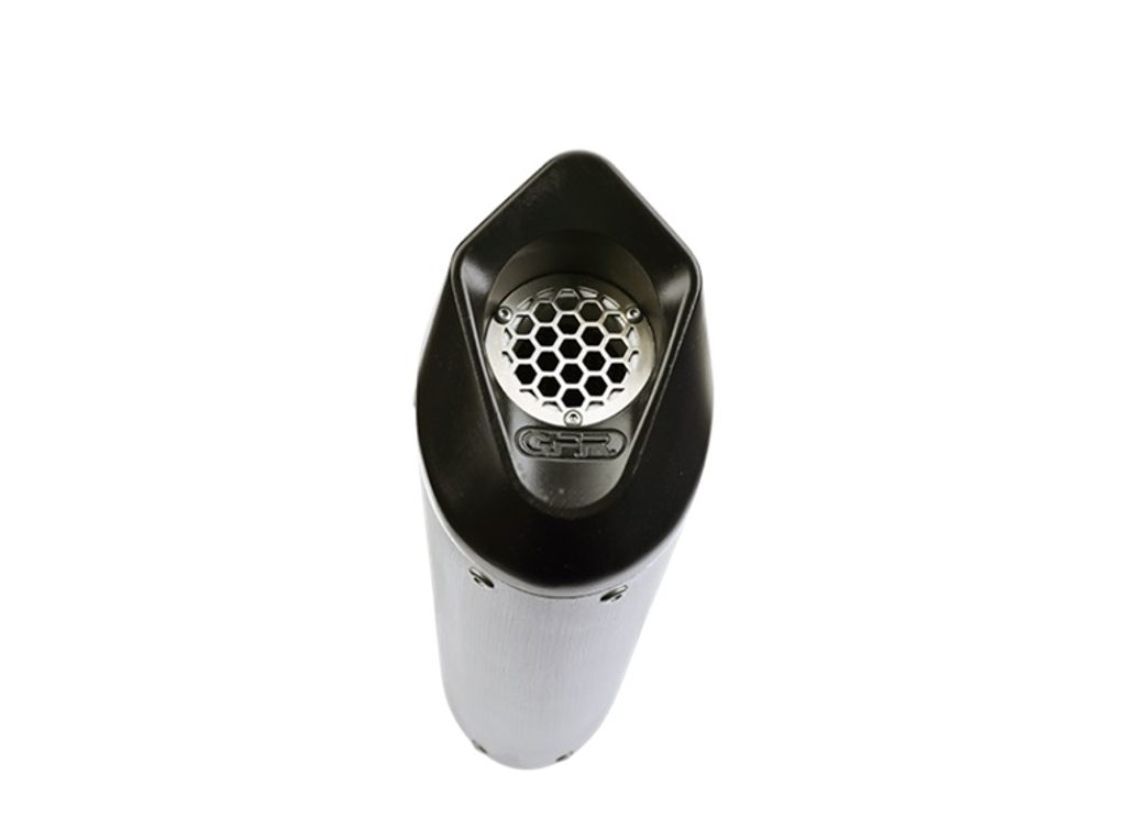 GPR's Furore Nero silencer has a black aluminum body, with avional caps made through CNC machining. It has a ceramic finish that withstands high temperatures, with an elliptical shape that measures 90mm x120mm.