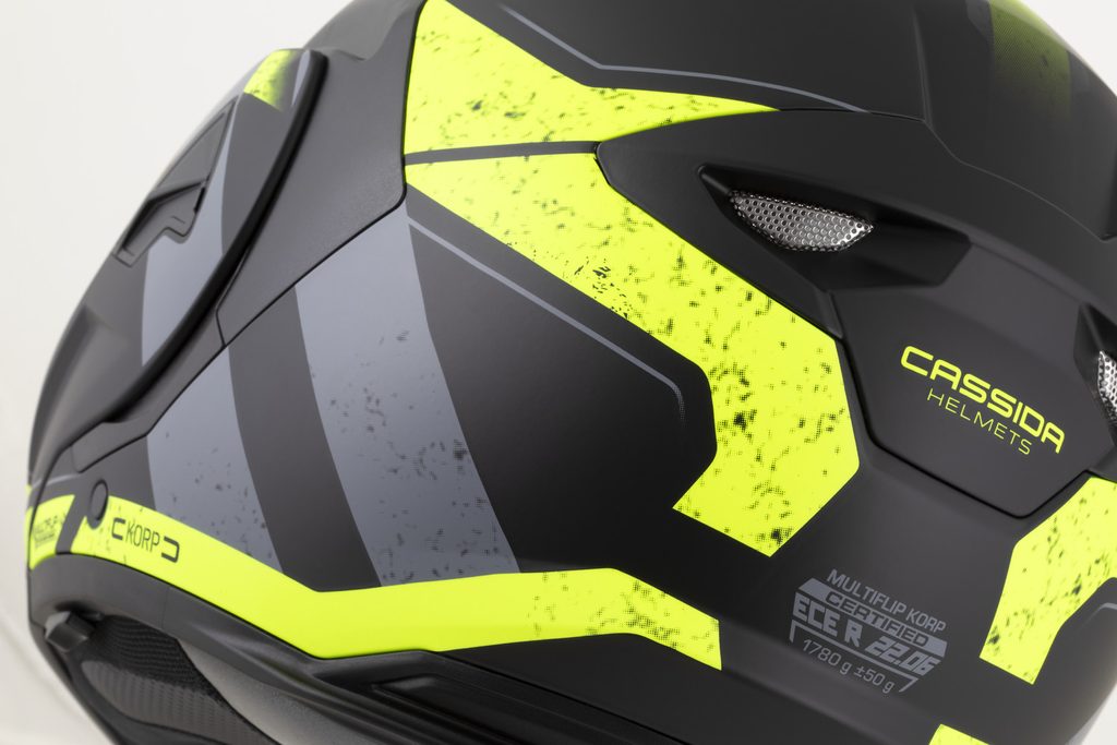 • Dual homologation ECE 22.06 P/J for both open-face and full-face use, with the option to lock the flip-up section in the open position using a safety latch.