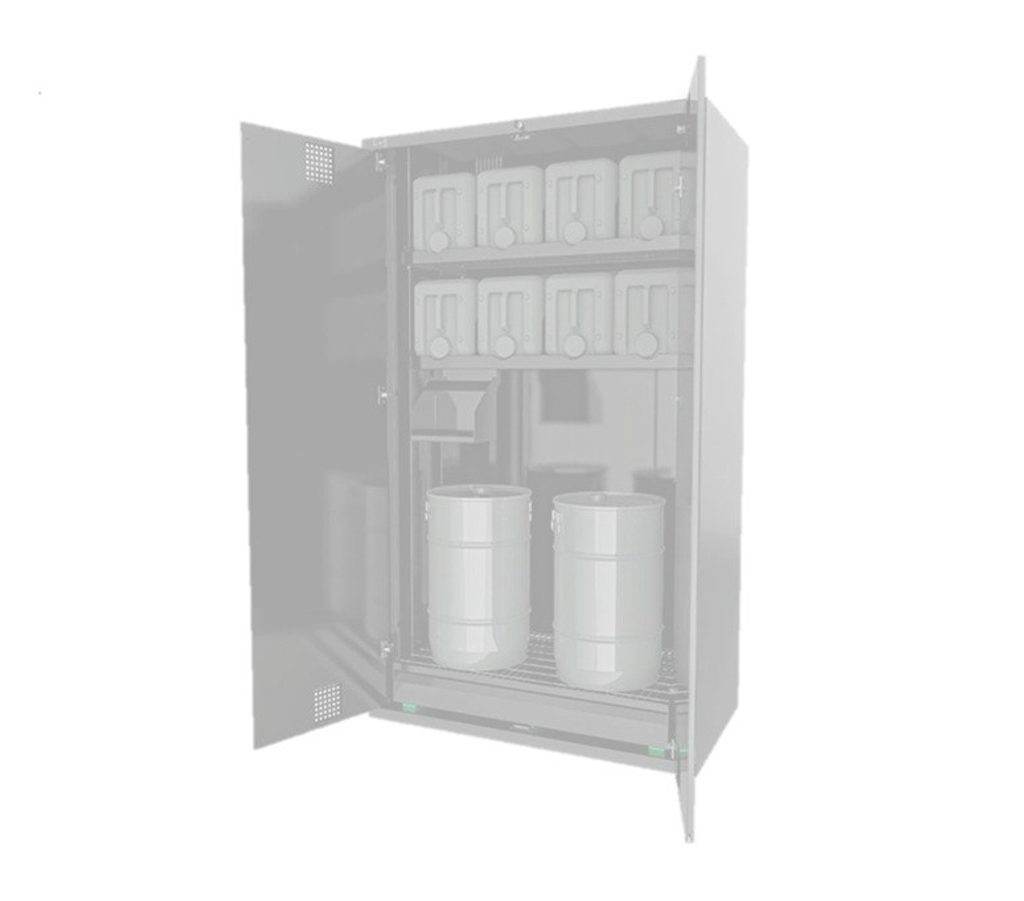 Closet for oil storage equipped with key lock, 3 sliding and height adjustable shelves, oil collection tank and ventilation holes for air circulation.