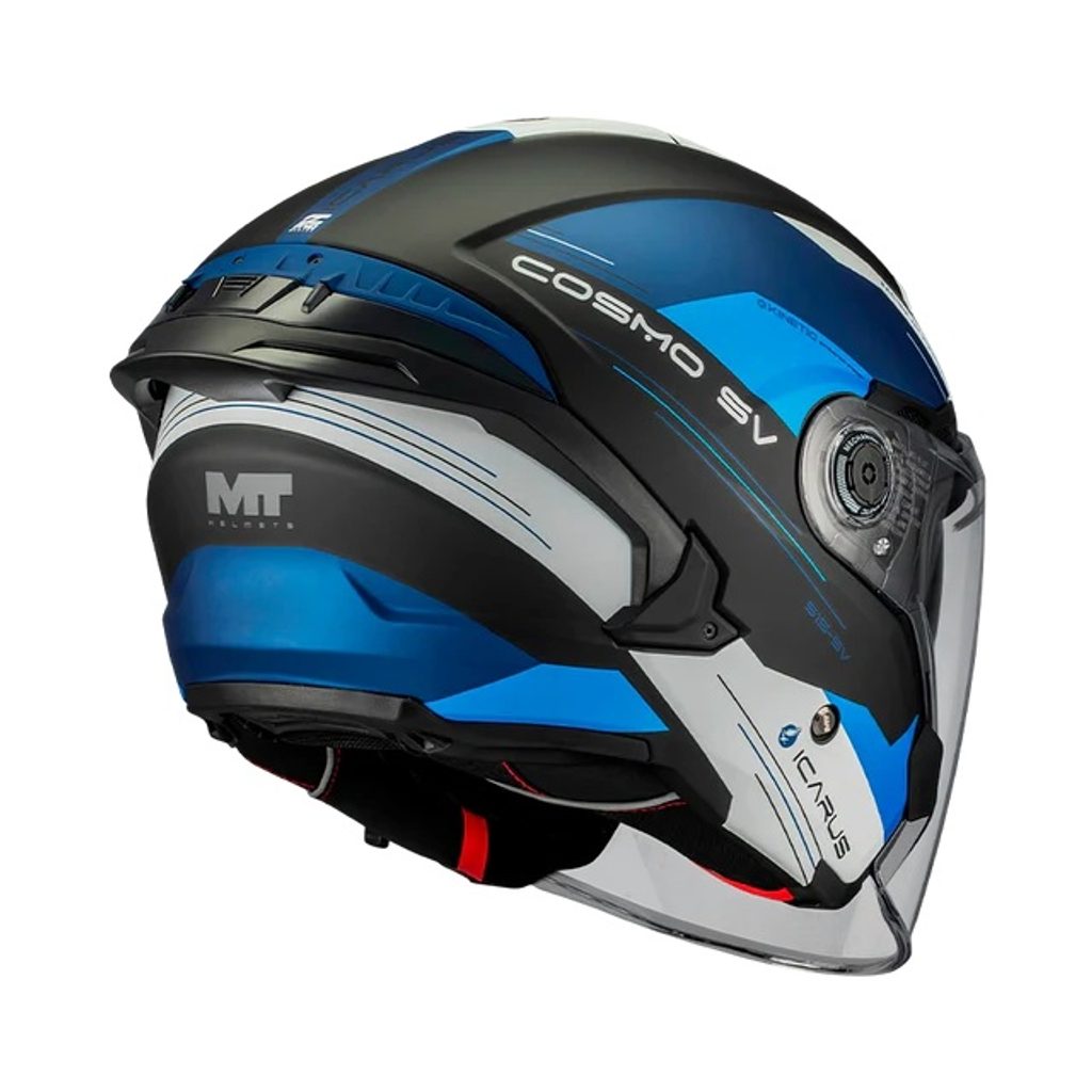 • MT-QVSS | Quick Visor Swap System: The Cosmo SV utilizes MT-QVSS (MT Helmets’ patented system), allowing rapid, easy visor swaps.