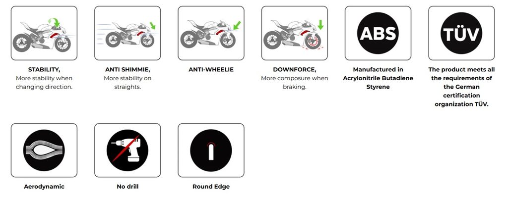 Thanks to this configuration, the system delivers up to 4.4 kg of downforce on the front axle, resulting in an anti-wheelie effect, greater high-speed stability (anti-shimmie), improved braking stability, and better behavior during directional changes.