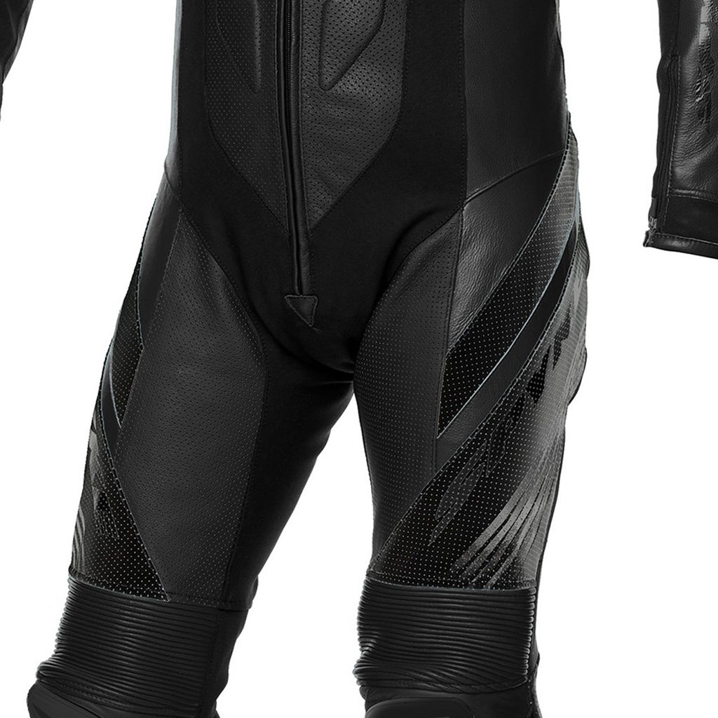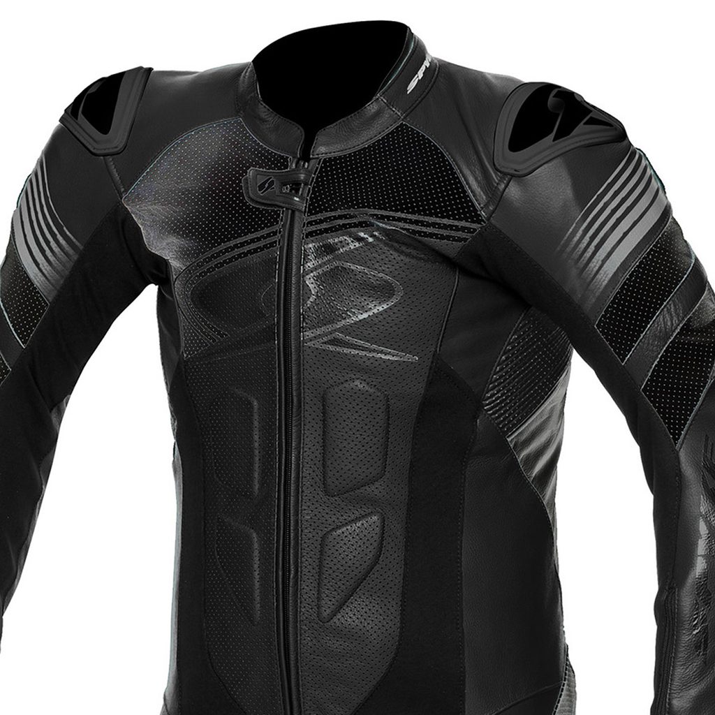 CE štitnici za ramena, laktove, kukove i koljena odobreni prema PN EN 1621-1:2012. Na stražnjem džepu za CE štitnik za leđa razine 2. Vanjski SPYKE logo štitnici za ramena i koljena. Vanjski, izmjenjivi klizač za lakat. Sva područja šivanja s konstrukcijom sigurnosnih šavova prema standardu EN 17092:2020. Perforirana koža sprijeda, straga, na rukavima i nogavicama za ventilaciju. Trkaća stražnja grba za poboljšane aerodinamičke performanse. Rukavi u trkaćem obliku. Zakopčavanje patentnim zatvaračem na rukavima i donjem dijelu nogavica sa “flat lock” sustavom (autoblokiranje i klizač protiv plutanja). Harmo umetci u laktovima, koljenima i leđima za veću udobnost. Neoprenske manžete za gležnjeve i zapešća. Rastezljiva tkanina za lijepo pristajanje. 1 unutarnji džep. Podstava koja se može skinuti. Klizači za koljena koji se mogu skinuti. Klizači uključeni.