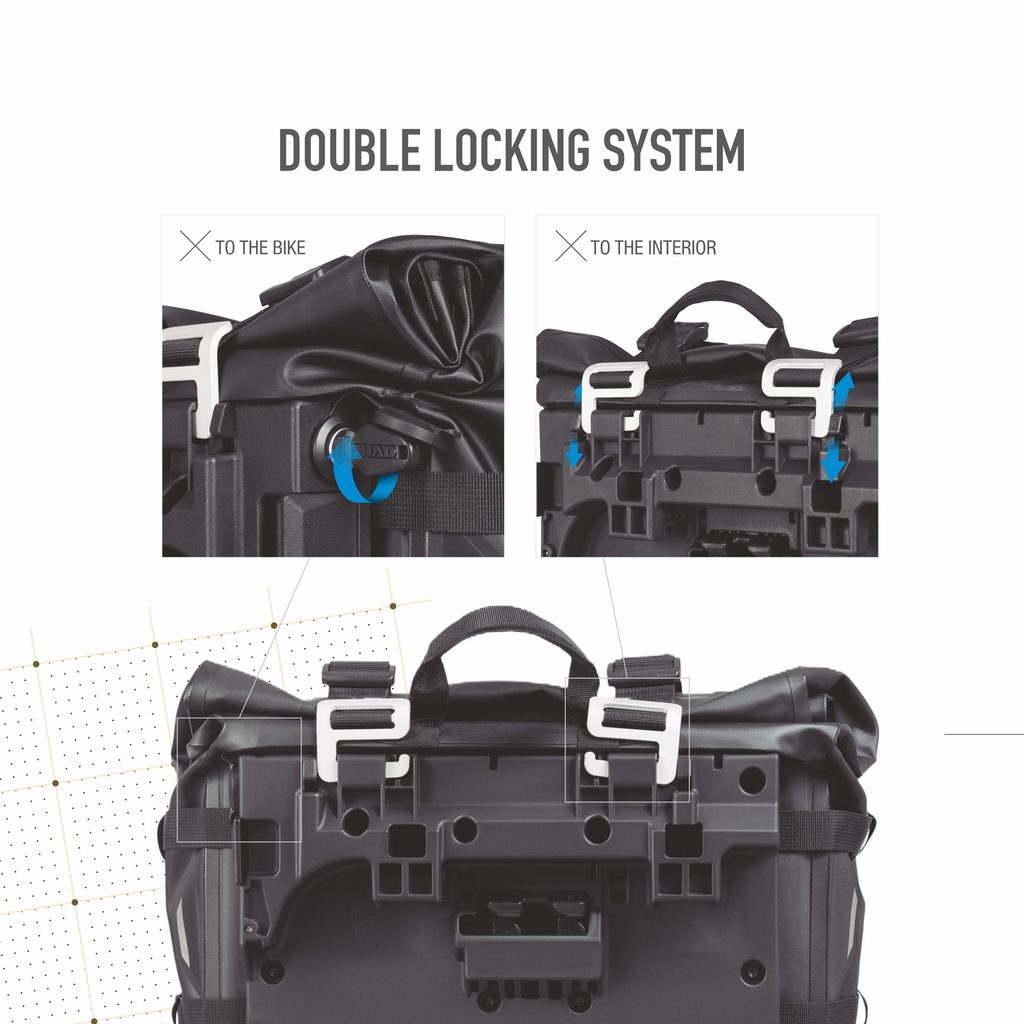 The TR30 adventure saddlebags stand out for their IPX6 waterproof rating and their “Double Locking System” closure system (patent pending) to lock the bag to the 4P and 3P fitting and the bag itself, preventing inside access.